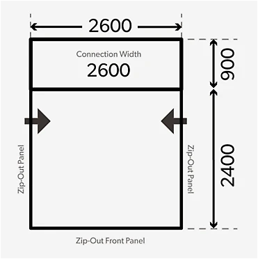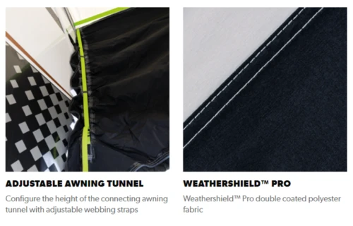 Front panels can be zipped out to reduce weight and to open the awning up Configure the height of the connecting awning tunnel with adjustable webbing straps Weathershield™ Pro double coated polyester fabric Generous dimensions maximise the livable space of your pitch Weight – 29.70 kg Width 2.6mtr Pack size 990 mm x 330 mm x 560 mm
