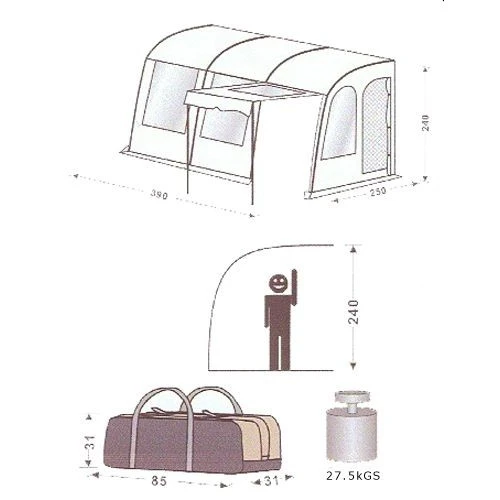 The Rally 390 is 250 cm deep and 390 cm wide, perfect for the larger caravan and in many instances an ideal replacement for the traditional caravan awning where ease of set up, weight and storage are taken into consideration.
