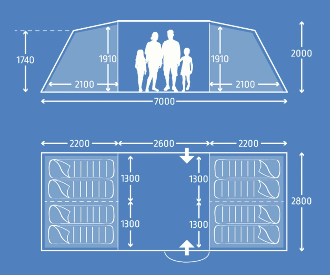 • Vis-a-vis style tent with 2 inner tent at either end that can be divided off to give 4 x 2 berth areas